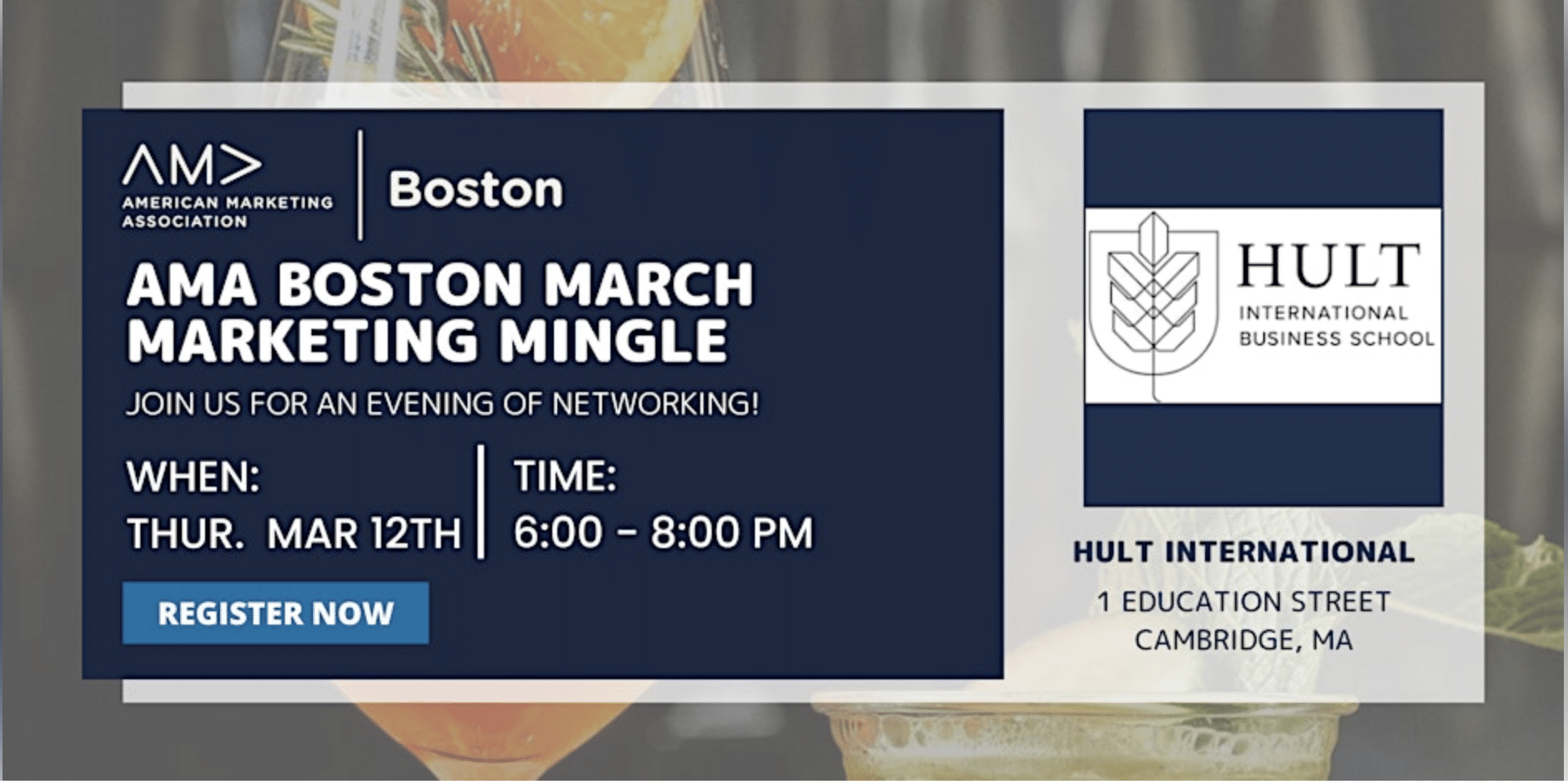 AMA Boston: March Marketing Mingle ByAMA Boston Following Hult InternationalCambridge, MA Thursday, Mar 12 from 6 pm to 8 pm Overview Get