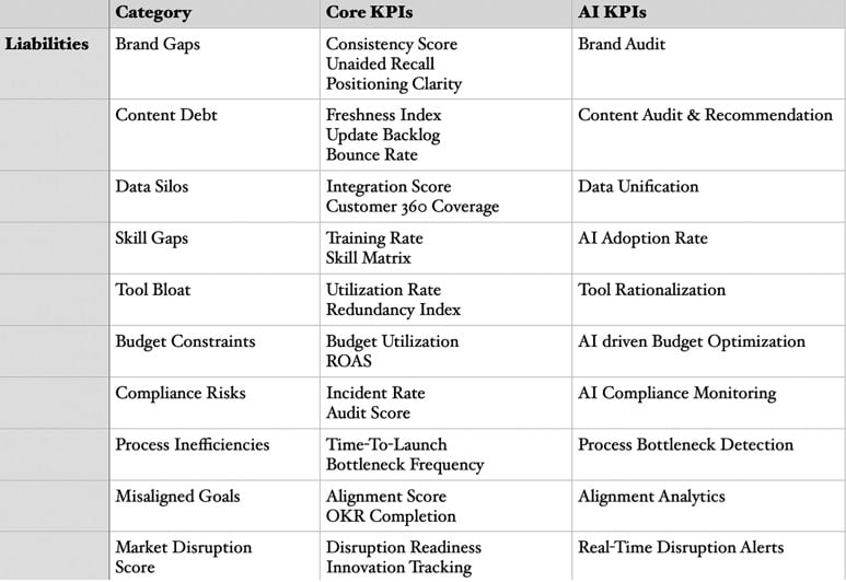 Liabilities are the inefficiencies and risks that erode marketing’s returns. These include: