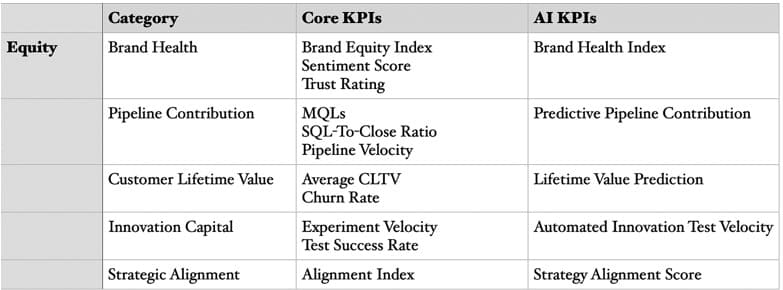 Equity is the “net worth” of your marketing function—the long-term impact after accounting for liabilities. Key dimensions include: